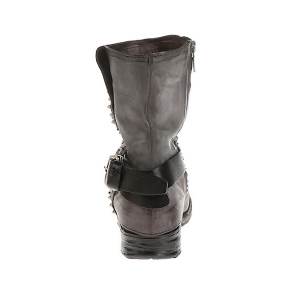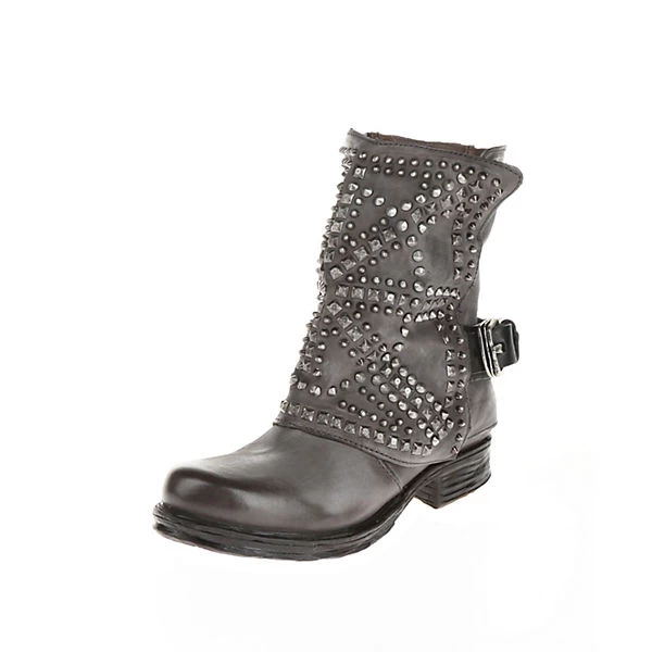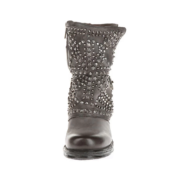 Aufregender Biker-Boot mit zahlreichen Nieten vorne am Schaft. Metallische Details komplementieren den sonst so schlichten Schnitt des Schuhs und machen ihn zu einem Hingucker.