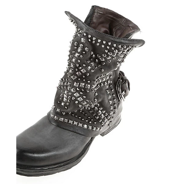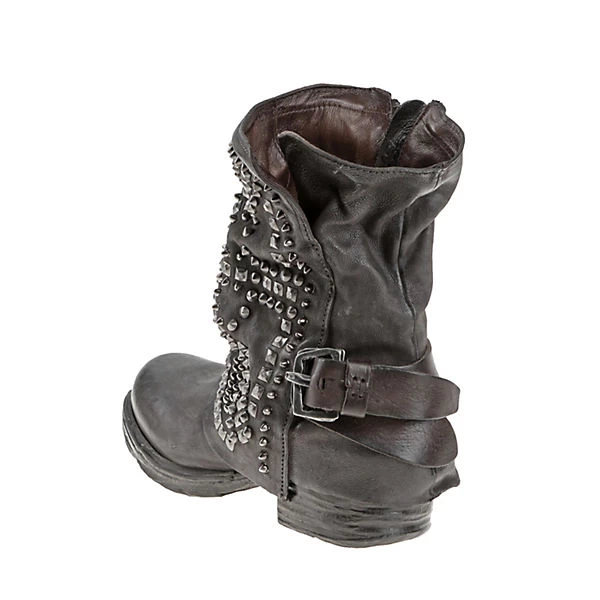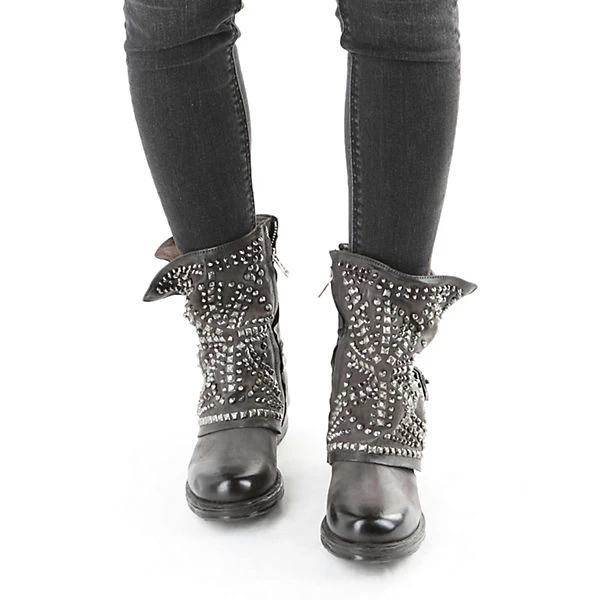 Aufregender Biker-Boot mit zahlreichen Nieten vorne am Schaft. Metallische Details komplementieren den sonst so schlichten Schnitt des Schuhs und machen ihn zu einem Hingucker.